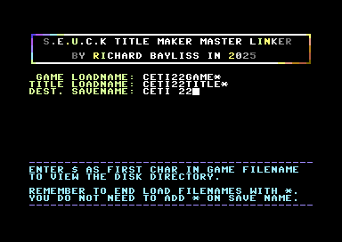 Eariler on, I was asked if it is possible to be able to load in existing text and colour assets from title screens that were made with version 1.5/V1.5+ of the SEUCK Title Screen Maker. I can confirm that it is possible. However you will need either an Action Replay / Retro Replay cartridge or a Machine Code Monitor.