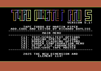 Tape Master Pro is an easy and very useful non commercial tape mastering tool for your Commodore 64. It allows you to create a tape master on your disk and then after a basic load and run master your own runnable game productions to tape. All you need is a disk (image) that contains a relocated loading music, a bitmap and a C64 game runnable from BASIC.